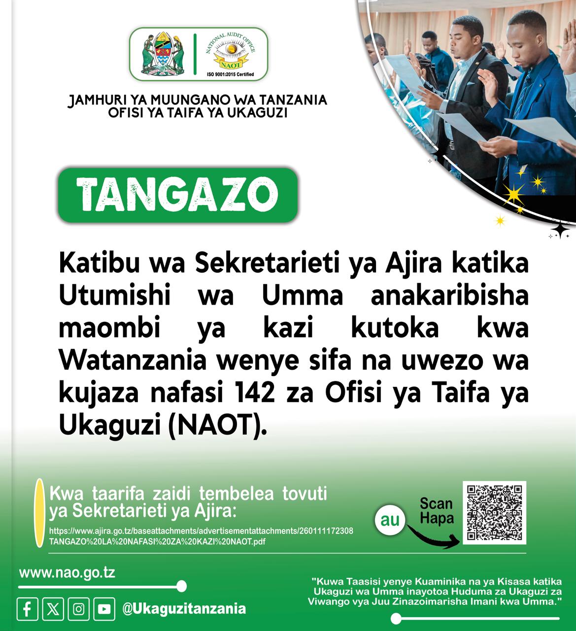 Katibu wa Sekretarieti ya Ajira katika Utumishi wa Umma kwa niaba ya Ofisi ya Taifa ya Ukaguzi (NAOT) anakaribisha maombi ya kazi kutoka kwa Watanzania wenye sifa na uwezo wa kujaza nafasi 142.