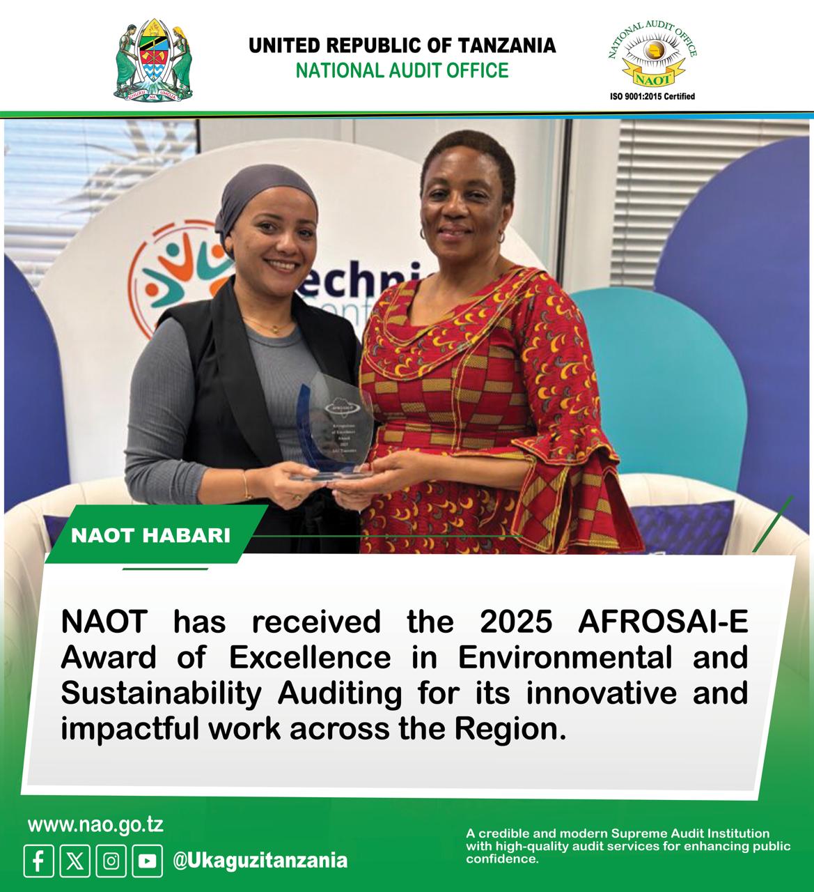 National Audit Office of Tanzania (NAOT) has received the 2025 AFROSAI-E Awards of Excellence in Environmental and Sustainability Auditing for its innovative and impactful work across the Region.